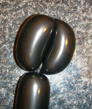 - Распределив воздух в шаре пополам, перекручиваем его и обматываем хвостик вокруг скрутки. Это будут глаза, которые закрепляются на носу (т.е. нос вставляется между глазами).