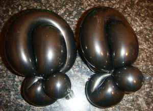 - Приступаем к изготовлению ног. Надуваем примерно наполовину черный ШДМ 260 и скручиваем подряд два одинаковых пузыря по 7-9 см.