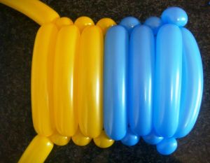 - С обоих сторон подвязываем по одному желтому ШДМ 260. Оставшиеся хвостики голубых шариков обрезаем, завязываем и прячем хвостики между пузырями.