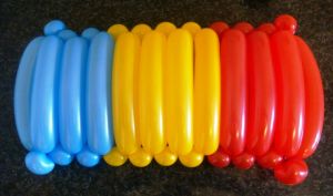 - Для изготовления парашюта надуваем голубые, желтые и красные ШДМ 260, оставляя хвостики по 3-4 пальчика.