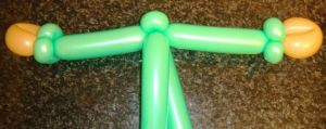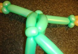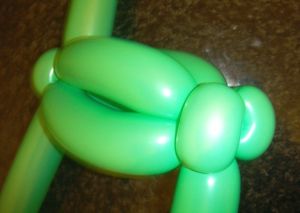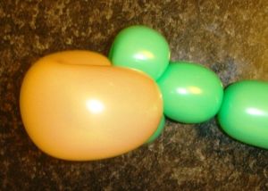 - Начинаем с головы. Надуваем один зеленый и один телесный ШДМ 260, оставляя хвостики по 5-6 пальчиков.