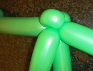 - Надуваем два зеленых ШДМ 260, оставляя хвостики по 5-6 пальчиков. Привязываем кулаки.